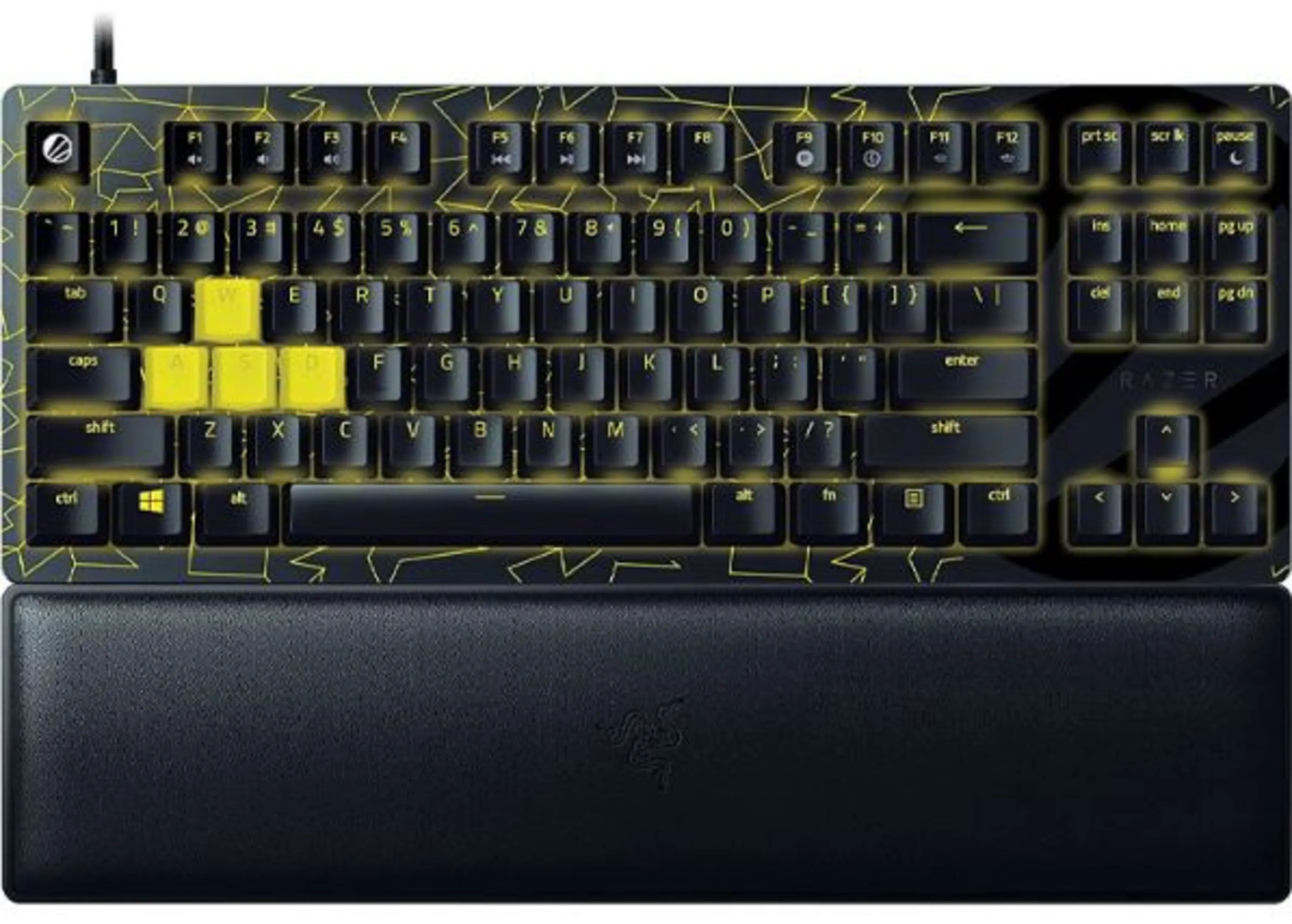 کیبورد Razer Huntsman v2 TKL دارای محلی برای قرارگیری مچ دست است تا هنگام استفاده احساس خستگی نکنید. این کیبورد با یک کابل USB-C به کامپیوتر شما وصل میشود و دارای حافظه داخلی و پشتیبانی از فضای ابری است برای ذخیره تنظیمات شما است.