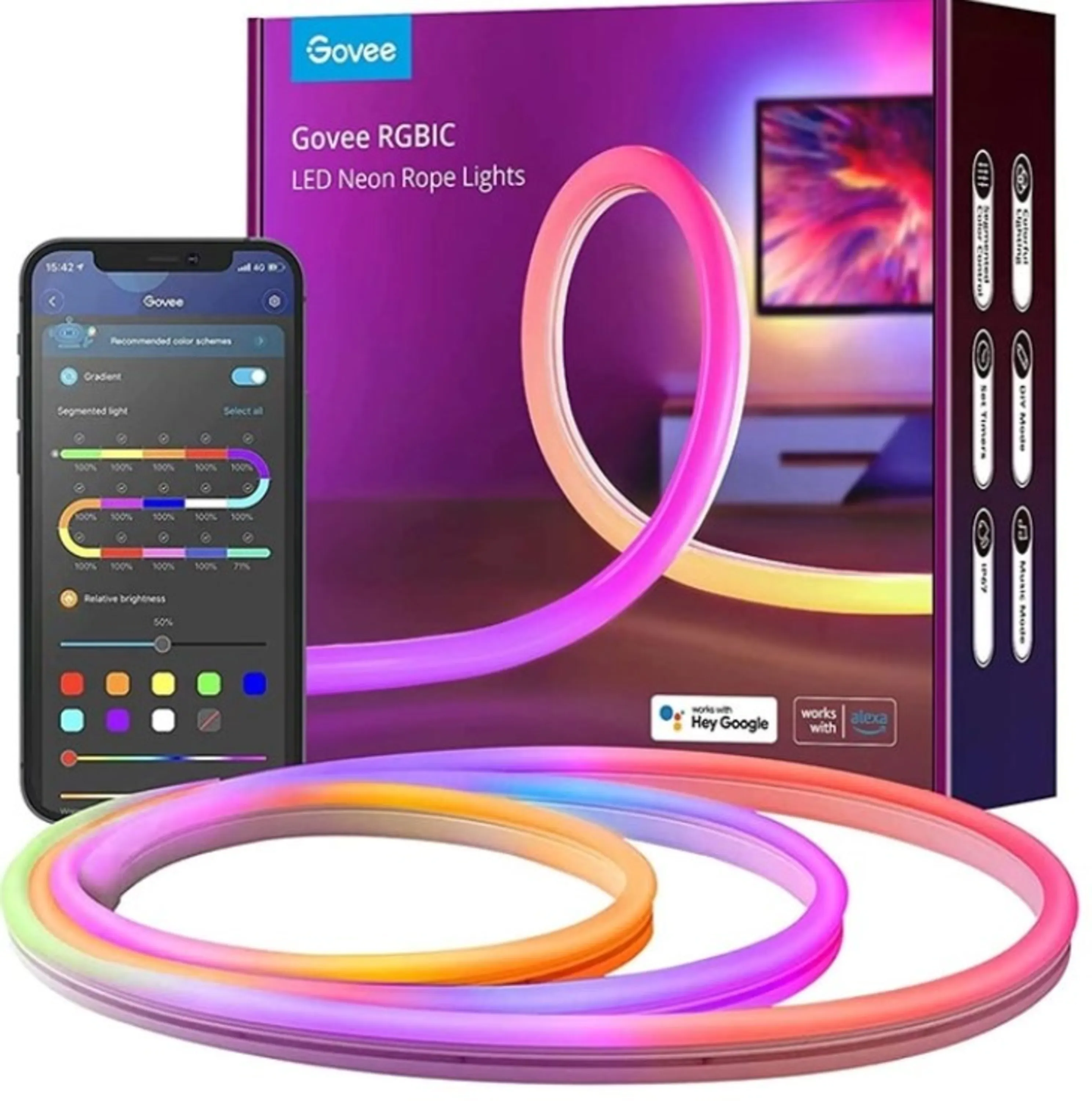 برای چراغ نئونی 3 متری گووی Govee Neon Rope RGBIC یک نرم افزار اندروید و iOS در نظر گرفته شده است که برای رنگ دار کردن محصول مورد استفاده قرار می گیرد. علاوه بر آن شما می توانید از قابلیت های ویژه دیگری که برای چراغ نئونی 3 متری گووی Govee Neon Rope RGBIC در نظر گرفته شده است استفاده کنید. برای مثال حالت های صحنه پیش فرض و همچنین حالت های همگام سازی محصول به صورت خودکار با موسیقی و صدای بازی از دیگر ویژگی هایی است که در خصوص چراغ نئونی 3 متری Govee Neon Rope RGBIC باید بیان کنیم.