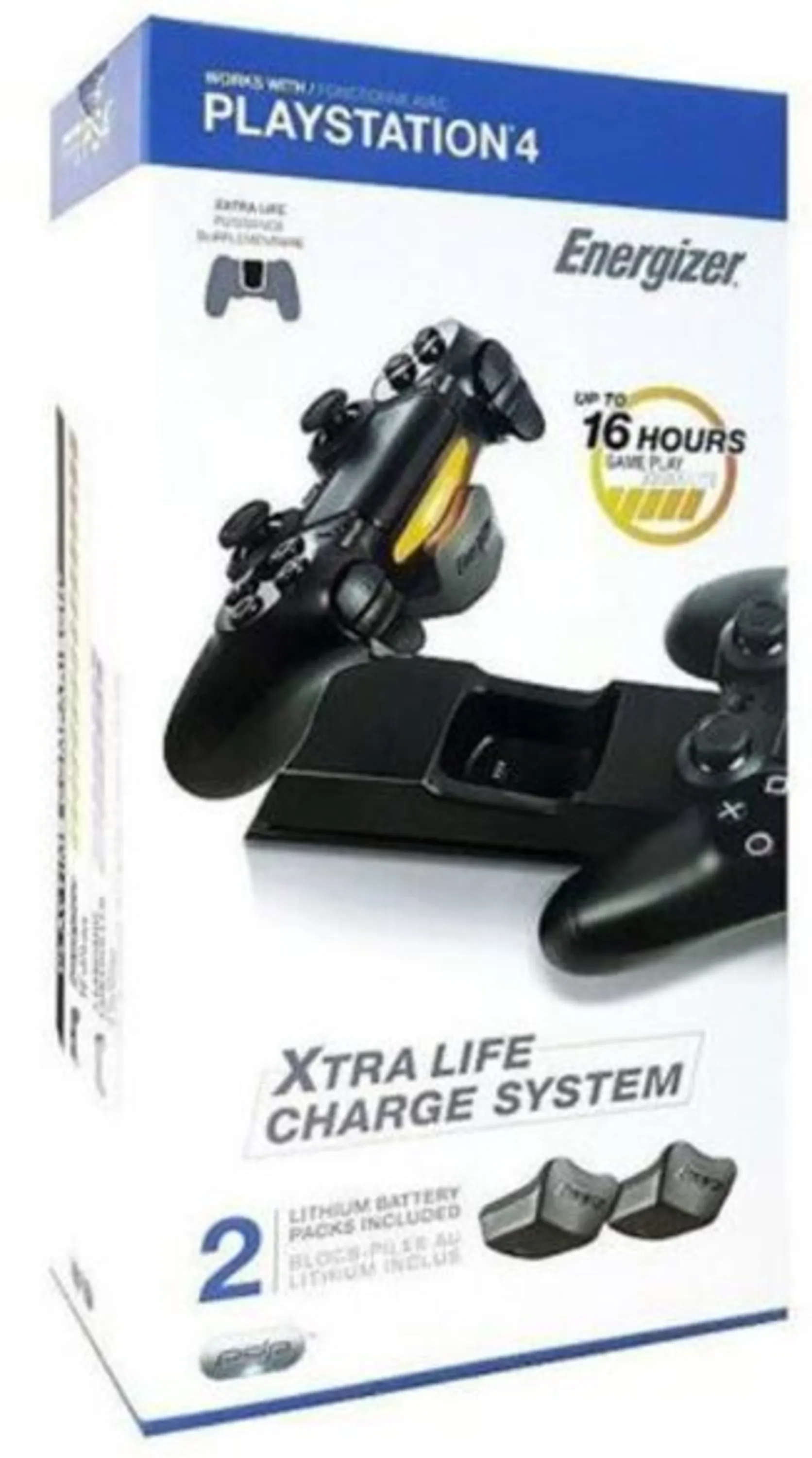 پایه شارژر Energizer Xtra Life محصولی از PDP برای دوال شاک 4 به شما این امکان را میدهد تا دو عدد کنترلر دوال شاک 4 را به صورت همزمان در کمتر از چهار ساعت شارژ کنید. این پایه دارای دو پورت مینی USB برای قرار دادن دوال شاک 4 است و میتوانید آن را به پلی استیشن 4 یا منبع برق دیگری وصل کنید. مقدار شارژ هر کنترلر با یک چراغ LED در پورت مشخص میشود. همچنین، این محصول دارای دو عدد باتری قابل شارژ است که میتوانید آنها را به دوال شاک 4 وصل کنید تا مدت زمان بیشتری از کنترلر خود استفاده کنید. این باتریها نیز با پورت مینی USB به کنترلر وصل میشوند.
