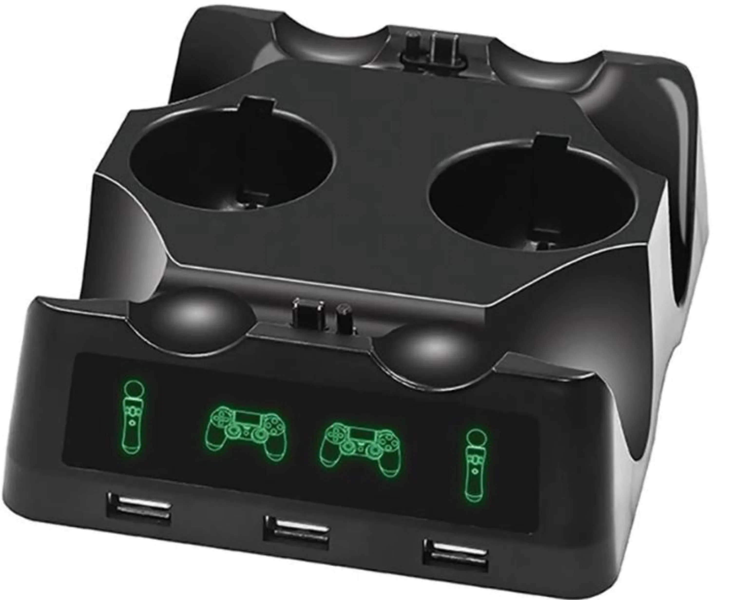 این پایه از پلاستیک ساخته شده است و روی میز یا سطوح صاف لیز نمیخورد. پایه شارژر iplay دارای نمایشگر LED برای نمایش میزان شارژ کنترلرها با دو رنگ سبز و قرمز است. این پایه شارژر با یک کابل USB به پلی استیشن شما یا منبع برق متصل میشود، دارای سه پورت USB برای اتصال وسایل جانبی است و هر چهار کنترلر را در مدت زمان دو الی چهار ساعت شارژ میکند.پایه شارژر iplay به شما این امکان را میدهد تا دو عدد کنترلر دوال شاک 4 و دو عدد کنترلر موو را به صورت همزمان شارژ کنید. طراحی منحصربفرد این پایه شارژر جذابیت خاصی به سیستم بازی شما میدهد و نظم خاصی به کنترلرهای شما میبخشد. شما میتوانید مستقیما دو عدد کنترلر موو را در پایه مخصوص آنها قرار دهید و دو عدد کنترلر دوال شاک 4 را از پورت EXT شارژ کنید که سرعت بیشتری نسبت به پورت مینی USB دارد.
