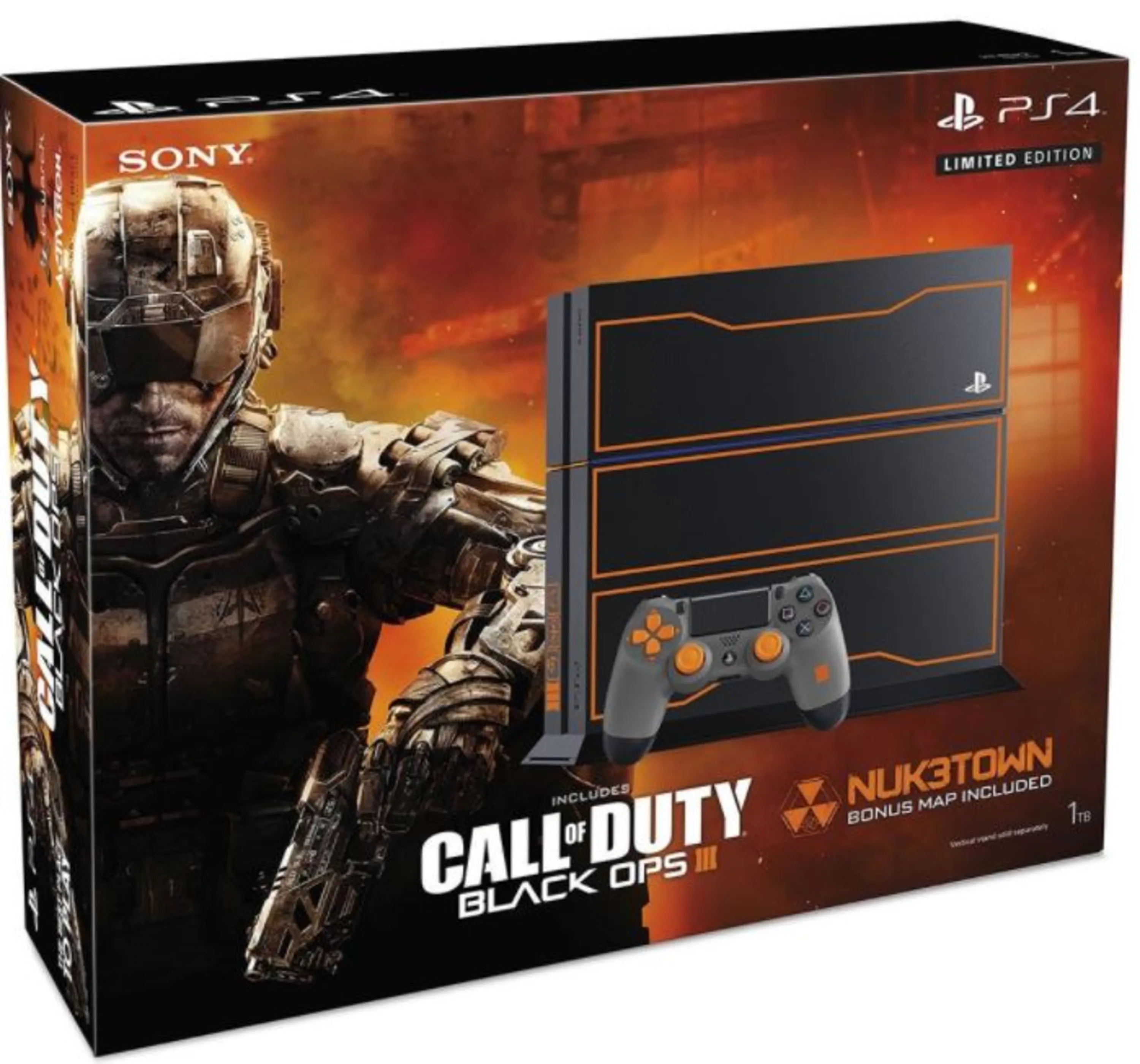 Includes: Fully customized 1 TB PlayStation 4 System and 1 customized DualShock 4 Wireless Controller inspired by the dark, futuristic world of Call of Duty: Black Ops III. Also includes AC Power Cable, HDMI Cable, USB 2.0 Cable, Mono Wired Headset, physical copy of Call of Duty: Black Ops III, and digital voucher for the Nuk3town Bonus Map