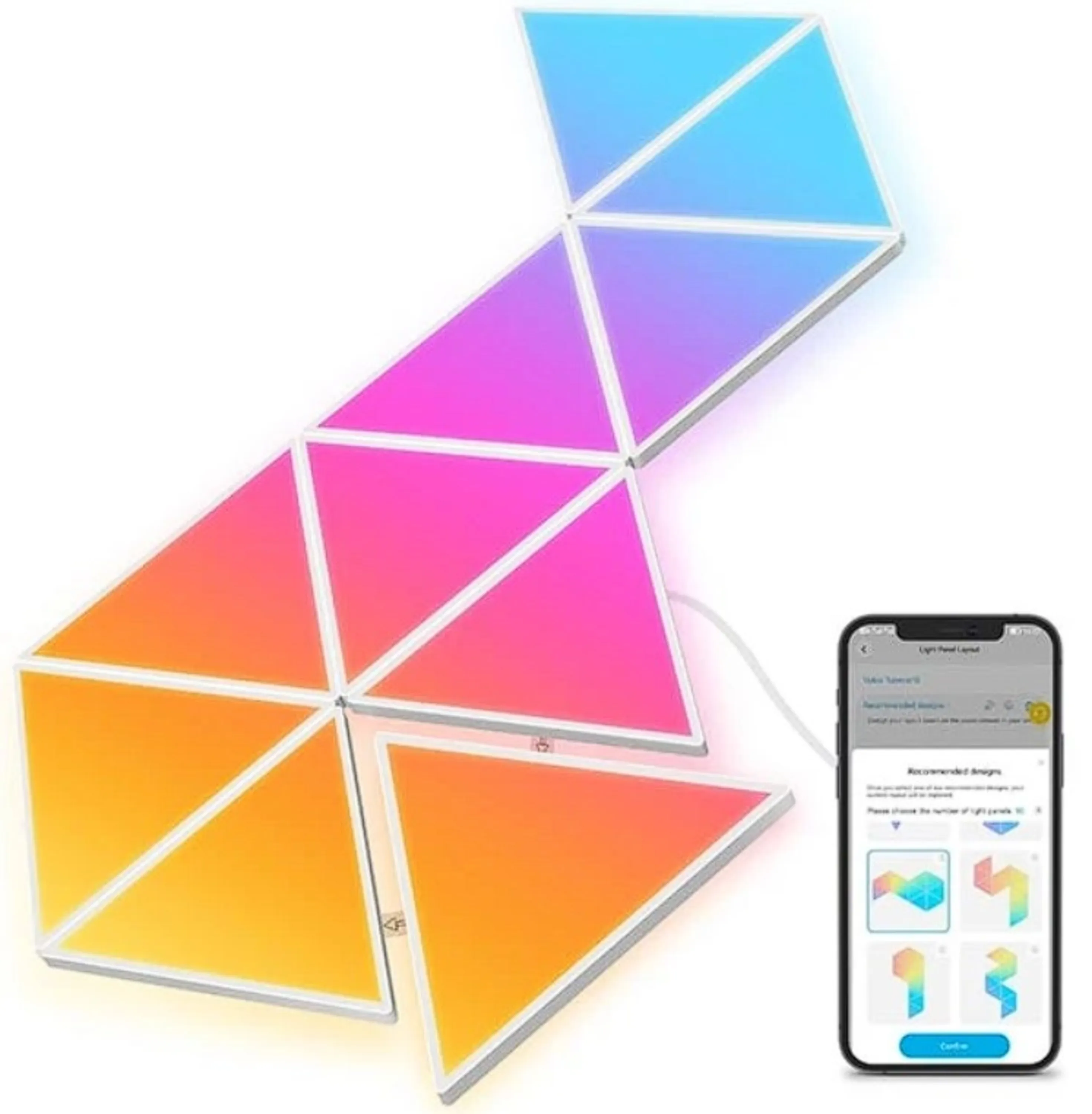 همانطور که از نام پنل هوشمند روشنایی 10 تکه Govee Glide Triangle Light Panels پیداست، این محصول از ده قطعه مثلی شکل بسیار جذاب و زیبا ساخته شده است که با کمک فناوری RGBIC توسعه یافته اند. هر کدام از این تکهها می توانند بنا به سلیقه مخاطب رنگ بندی متفاوتی به خود بگیرند و به طور کلی هر پنل می تواند چندین رنگ را به طور همزمان نمایش دهد. پوسته شفاف این پنل ها اجازه می دهد تا مستقیماً با درخشش فلورسنت منحصر به فرد، دیواره های شما یک رنگ بندی جذاب و کم رقیب به خود بگیرد. البته این تنها آزادی عمل این محصول نیست! شما می توانید به صورت کاملاً سلیقهای این پنل های مثلثی شکل را در کنار هم قرار بدهید. تصور این که با این الگوهای 10 تکه می توان تا چه اندازه تصویر و المان طراحی کرد، دیوانه کننده به نظر می رسد! سازندگان تکنولوژی آزادانه نورپردازی این محصول را نورپردازی DIY می نامند که نسل جدیدی از پنل های هوشمند محسوب می شود. برای این کار تنها کافیست از طریق برنامه هوشمند این محصول، سلیقهتان را اعمال کنید. از همه مهمتر این محصول برای اتصال به دیوار نیاز به هیچ دردسر یا کار مکانیکی ندارد. با استفاده از یک کابل مقاوم بدون به هم خوردن ظاهر محصول می توانید از این محصول استفاده کنید. خلاصه آن که سازندگان در تمامی زمینه ها سعی کردهاند اصول آزادی عمل و راحتی را رعایت کنند.