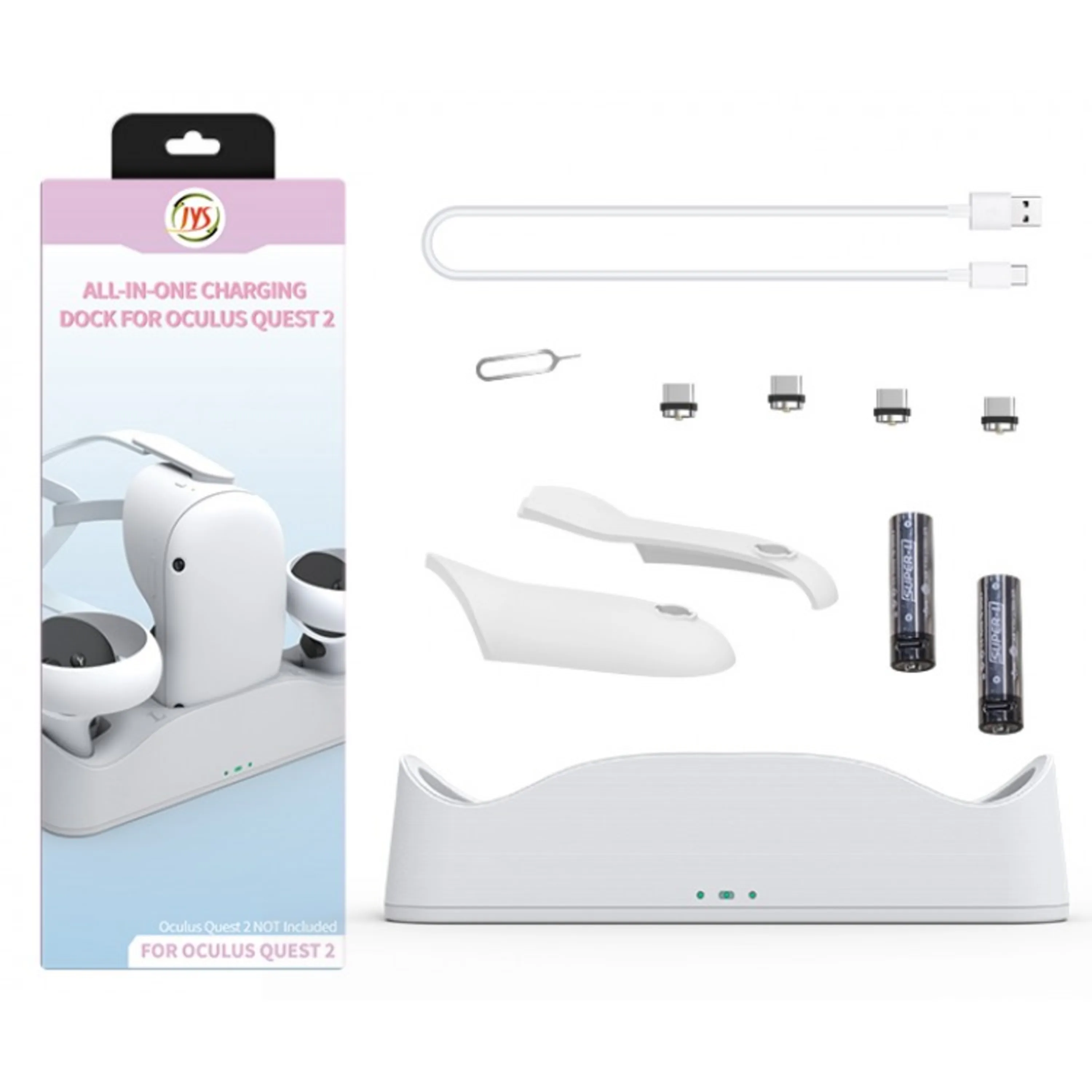 این محصول شامل دو عدد باتری قابل شارژ مخصوص کنترلر اکولوس تاچ با ظرفیت 1800 میلی آمپر ساعت و کانکتورهای USB-C مغناطیسی که به پورت شارژ هدست و کنترلرها وصل میشوند تا آنها را روی پایه قرار دهید. این پایه شارژر میتواند هدست را در 3.5 ساعت و هر کنترلر را در 2.5 ساعت شارژ کند.